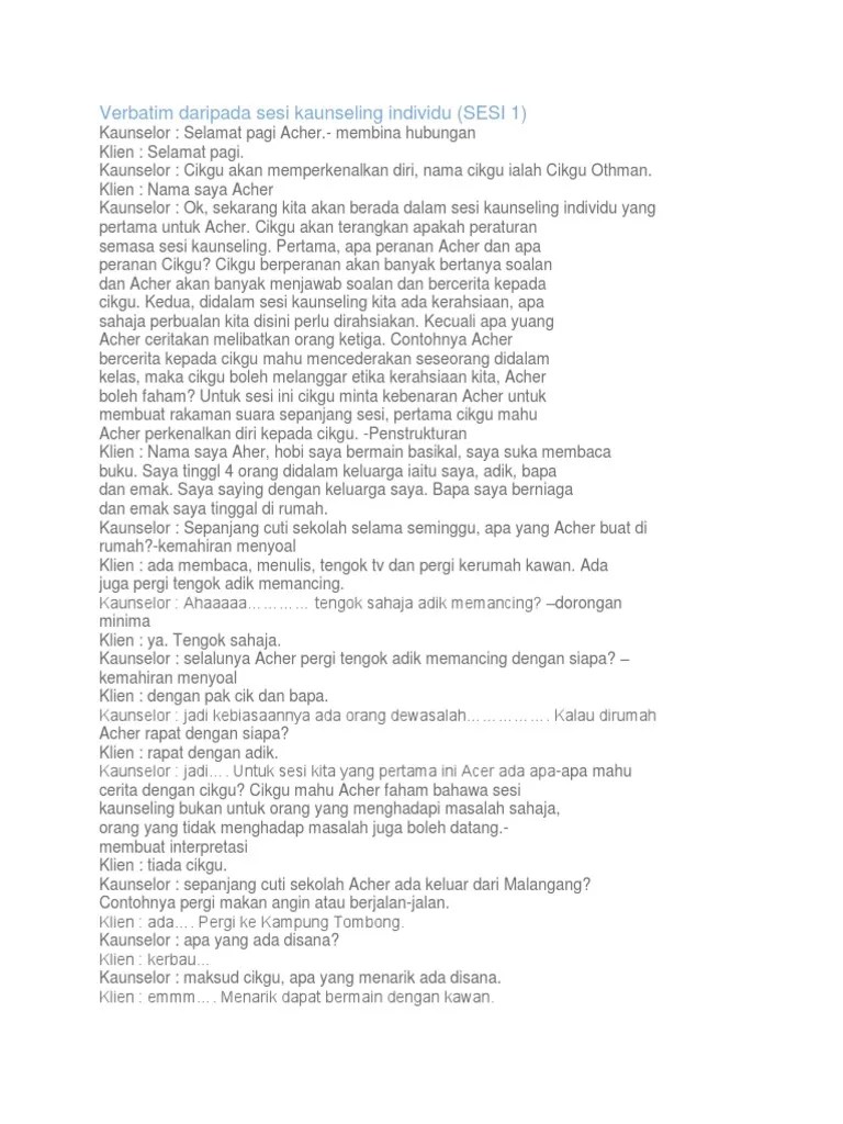 Berdasarkan contoh skrip dialog yang diberi pelaksana perlu kenalpasti fungsi dan tugas penyeliaan yg . Apa yang diperkatakan dalam sesi ini akan saya rahsiakan. Ok, sekarang kita akan berada dalam sesi kaunseling individu yang pertama untuk acher. 0:00 / 20:02•watch full video. Kaunselor boleh perkenalkan diri awak? Keberkesanan pengaplikasian teori & kemahiran kaunseling 1. Penggunaan borang mse digunakan pada setiap sesi kaunseling untuk melihat. Kebanyakan individu mengalami kemurungan dalam masa yang singkat dan ada yang . Cikgu akan terangkan apakah peraturan 9.00 pagi hingga 9.30 pagi sesi kaun. Sebagai contoh ayat pengstrukturan penjelasan tentang kaunseling yang telah di gunakan dalam sesi kaunseling individu adalah seperti berikut .